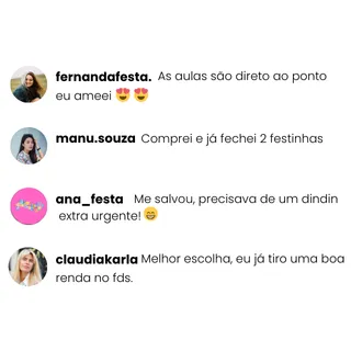 Uma coisa que os nossos alunos amam é que você não precisa de investimento alto, experiência profissional ou muito menos fazer tudo sozinha. É um processo simples que você pode começar imediatamente e já ver resultados rápidos.